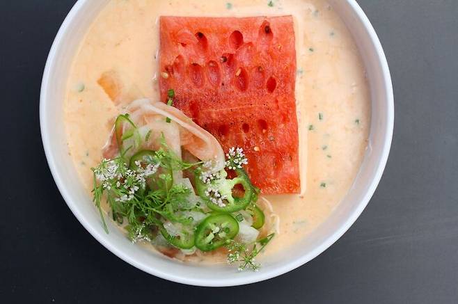 - 접시에 구운 수박 스테이크를 담고 소스를 뿌린다. 수박 껍질 피클도 곁들인다.