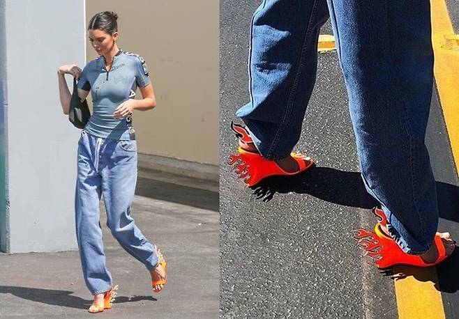 더운 것으로써 더운 것을 다스린다는 말이 있다. 슈퍼 모델 켄달 제너는 최근 뜨거운(?) 화염 웻지힐을 신고 지열로 뉴욕 거리를 활보해 눈길을 끌었다.