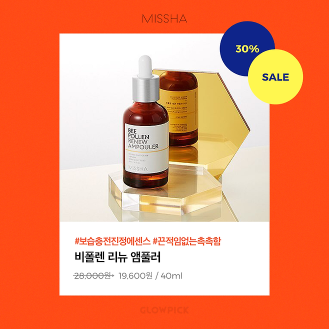 출시 이후 꾸준히 글로우픽 어워드에서 수상할 정도로 미샤의 대표 제품으로 자리 잡은 비폴렌 리뉴 앰풀러도 세일 중! 푸석하고 민감한 피부에 보습을 꽉 채워주는 진정 에센스인데요~ 영양을 가득 담아 실처럼 쭈욱 늘어나는 제형이지만 마무리감은 끈적임 없이 촉촉하다는게 최고 장점! 속건조가 느껴지거나, 탄력없이 푸석해진 피부라면 미샤 비폴렌 리뉴 앰풀러 사용해보세요:)