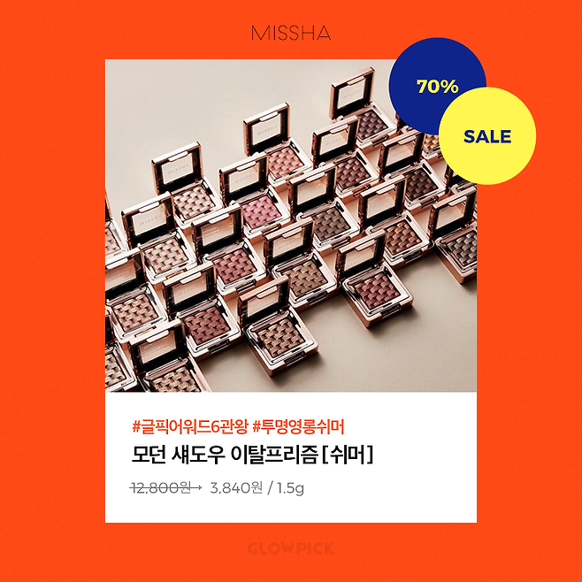 무려 4600여명의 글로우픽 유저가 리뷰를 남길 정도로 인기 있는 미샤 대표 싱글 섀도우! 모던 섀도우 이탈프리즘은 수많은 리뷰 중 부정 리뷰가 65개 뿐일 정도로 많은 사랑을 받고 있는데요~ 이번 미샤데이에서는 무려 70% 할인하여 3000원 대로 구매할 수 있다고 해요! 영롱하지만 깔끔한 쉬머 섀도우로 애교살은 물론 눈두덩이 포인트로 사용해도 과하지 않은 활용도가 높으니 아직 사용해보지 않으신 분이라면 이번 세일을 놓치지 마세요~