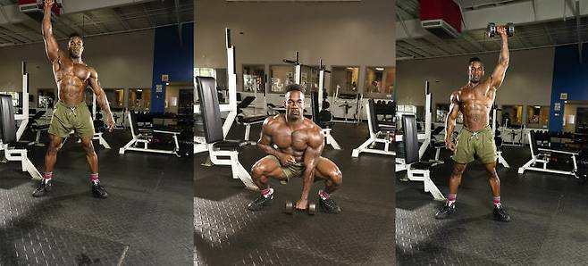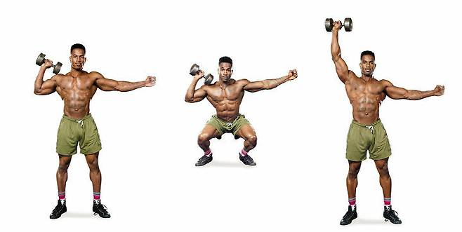 덤벨을 어깨 바로 위로 들고 스쿼트로 내려가며 덤벨을 머리 위로 올리자. 이 동작을 하나의 움직임으로 부드럽게 하되 허리의 부상을 막기 위해 코어 전체에 힘을 주면서 움직임을 통제하자.