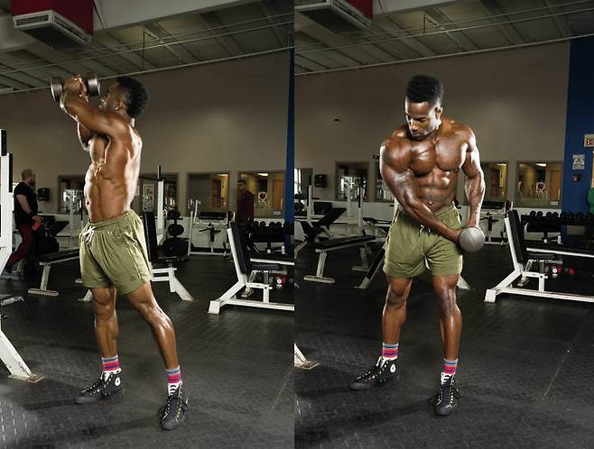 동작을 반복할 때 위팔의 뒷부분이 바닥에 아예 놓이는 것이 아니라 살짝 닿도록 하자. 팔꿈치가 살짝 구부러지도록 유지하고 천천히 조절하면서 덤벨이 어깨 바로 위에 올 때까지 올려 팔을 직선으로 만들자.