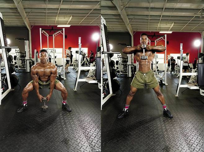 덤벨 한쪽 끝을 양손으로 잡고 턱 바로 아래에 위치시킨다. 스쿼트 동작으로 일어나고 앉는 내내 코어는 단단하게, 상체는 곧게 유지하자. 매 반복마다 넓적다리와 바닥이 최소한 평행을 이루게 만들자.