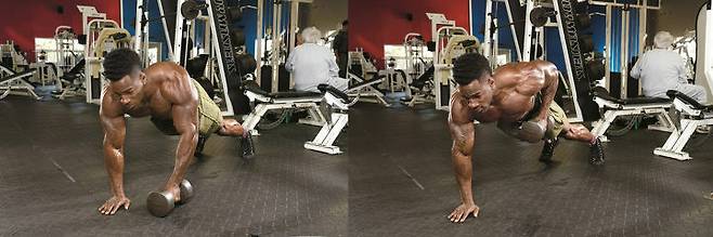 플랭크 자세에서 한 손은 바닥을 짚고, 다른 한 손은 덤벨 손잡이를 잡자(손바닥이 안쪽을 향한다). 덤벨을 옆구리를 향해 일직선으로 당겨 올리고 다시 천천히 낮추자. 가슴은 항상 바닥을 향하게 유지해야 한다. 정점에서 상체를 비틀지 않도록 주의하자.