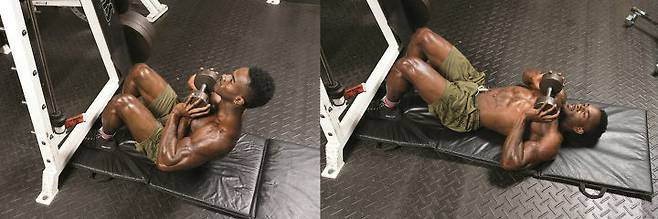 양손으로 덤벨을 들어 가슴 앞에 위치시킨 상태에서 상체를 일으키고 다시 낮추자. 난도를 더 높이고 싶다면? 양팔을 쭉 펴서 덤벨을 머리 위로 보낸 상태에서 동작을 수행하면 된다.