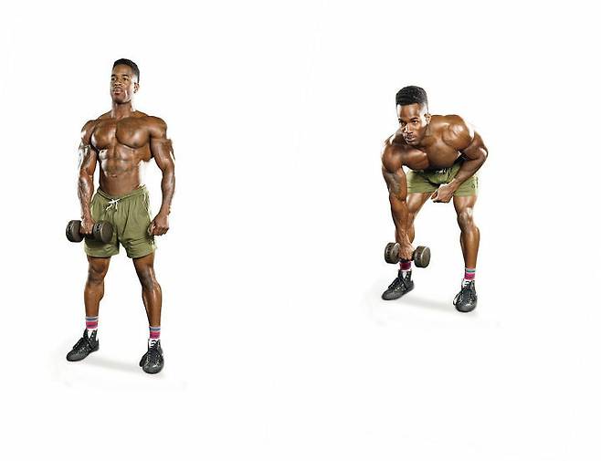 덤벨을 한 손으로 들고 세트의 절반을 수행한 다음 반대 손으로 들고 나머지 절반을 수행하자. 짧은 시간 안에 동작을 수행한다고 해도 자세는 제대로 잡아야 한다. 동작을 수행하는 어떠한 순간에도 허리가 둥글게 굽어서는 안 된다. 난도를 높이고 싶다면 한쪽 다리를 뒤로 들어 올리자. 동작을 반복할 때마다 다리도 바꿔준다.