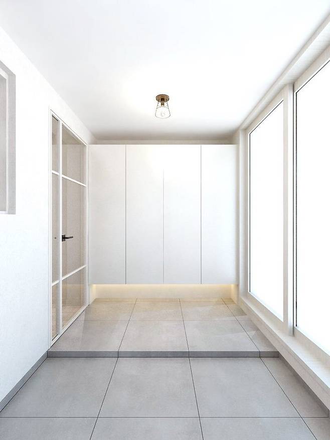 자전거, 유모차 등 큰 짐을 놓기에 좋은 서비스 면적이었지만 첫인상이 지저분해 보이기 쉽죠. 전 실용성과 디자인적 요소를 다 잡고 싶어서 신발장을 설치하고 현관으로 변경했어요.