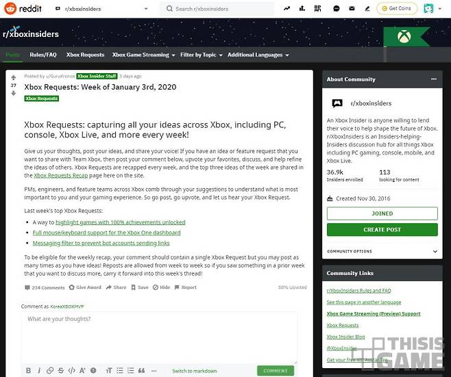 한국MS는 Xbox 라이브 골드 무료 게임 구성에 대해 요청 혹은 의견 건의 진행을 하려면 해외 소셜 사이트 '레딧' 내 'Xbox Insiders' 리퀘스트 페이지를 이용하라고 답변했다.