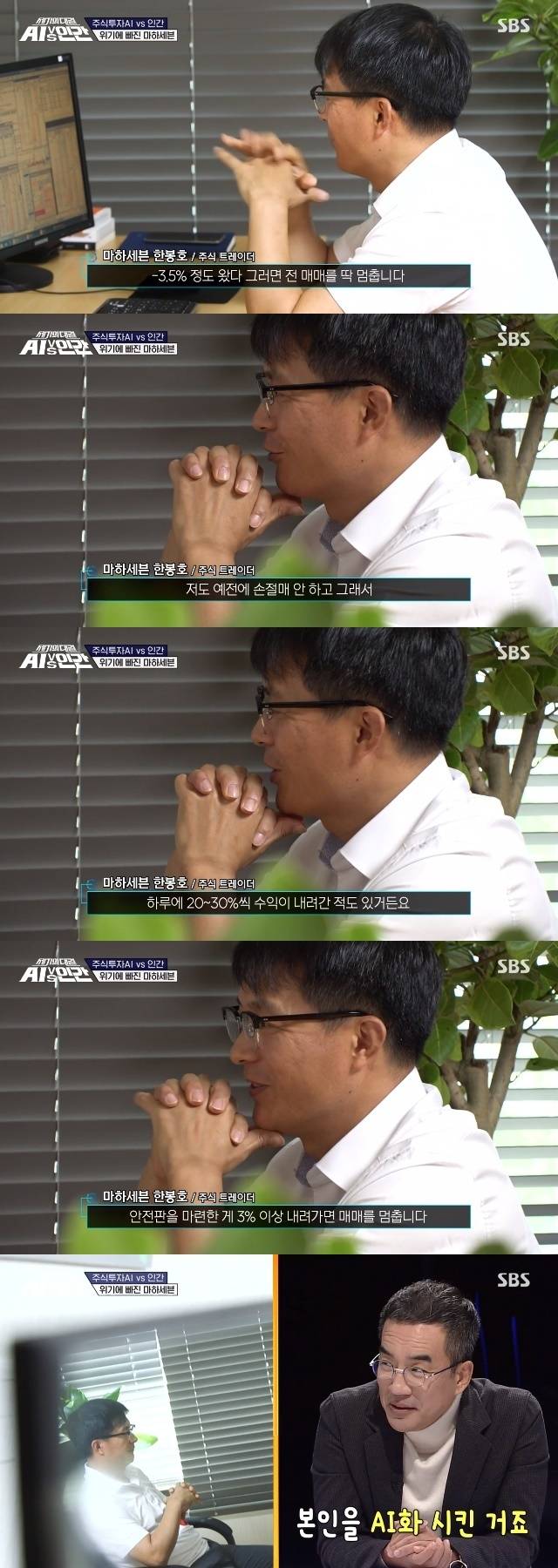 2월 6일 방송된 SBS 신년특집 예능 '세기의 대결! AI vs 인간'(이하 'AI vs 인간') 4회에서는 투자의 귀재 한봉호 대표(마하세븐)과 주식투자AI 사이의 1억 주식투자 대결이 펼쳐졌다.