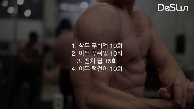 그대로 팔을 굽혀 딥을 합니다. 팔꿈치가 뒤로 빠지는것 보다 수직을 유지한 상태로 하는것이 팔 뒷쪽에 자극이 더 많이 갑니다.