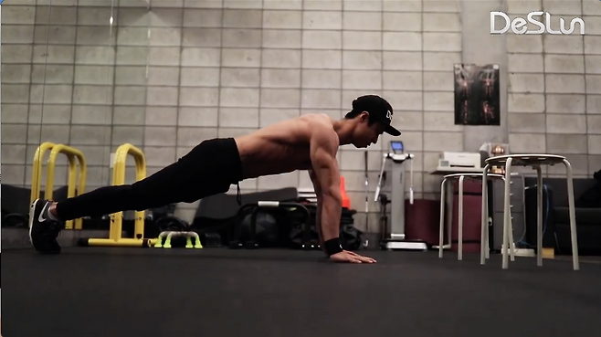 일반 푸쉬업 자세로 시작 합니다. 팔이 어깨와 수직인 상태에서 하는게 가장 힘들고 위쪽으로 짚을수록 난이도가 낮아 집니다.