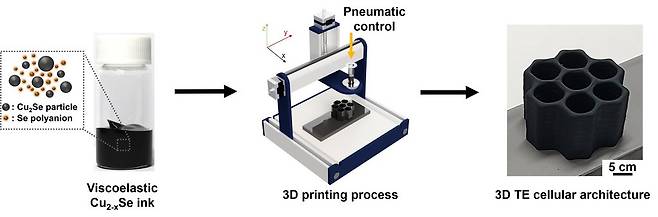 (울산=연합뉴스) 울산과학기술원(UNIST)이 신소재공학과 손재성·채한기 교수 연구팀과 미국 애리조나 주립대 권범진 교수가 차세대 발전으로 꼽히는 열전발전기의 내구성과 효율을 개선하기 위해 열전 소재인 구리-셀레나이드를 잉크로 만들어 벌집 형태로 3D 프린팅하는 기술을 개발했다고 15일 밝혔다. 사진은 구리-셀레나이드 3D 프린팅 공정. 2021.6.15 [울산과학기술원 제공. 재판매 및 DB 금지]