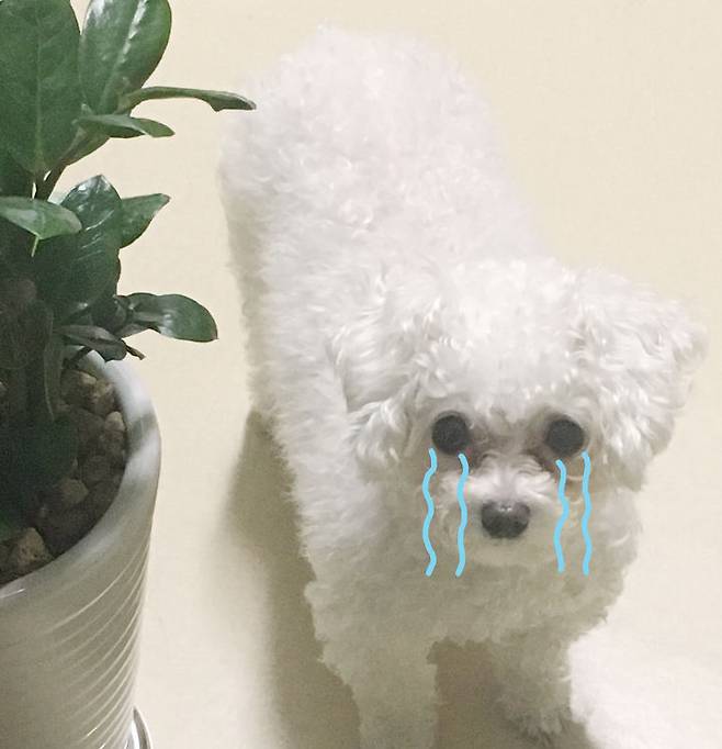 8개월 전 제 반려견 콩이의 모습입니다. 콩이는 눈물량이 정말 많은 편이에요. 눈물 얼룩 리무버로 관리 후 산책을 가도 저 정도였으니... 갖은 노력을 다해 지금은 많이 나아졌지만, 정말 힘든 싸움이었습니다...