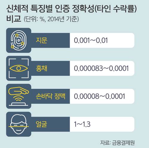 금융권에서는 2000년대 초 우리은행이 현금자동입출금기(ATM)에 지문인식 기술을 내장, 통장이나 카드 없이 지문과 비밀번호만으로 은행 업무를 처리할 수 있도록 했다. 이후 몇몇 금융사들이 지문인식 기술을 도입했지만 반응은 시원찮았다. 생체정보를 금융기관에 제공한다는 데 대한 불안감, 느린 단말기 보급 속도 등으로 이용자가 많지 않았다.