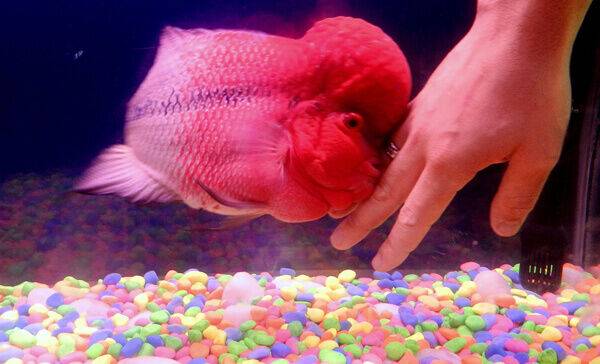 ‘플라워혼’은 시클리드과에 속하는 여러 물고기를 교잡해서 탄생한 혼혈 물고기로, 현재 생존하고 있는 플라워혼은 ‘금강 혈앵무’와 남미 시클리드인 ‘그리니시 골드타이거’의 교잡종입니다. 화려한 무늬와 머리 위에 돋아난 큰 혹이 특징으로 성체는 25~30㎝까지 자라는 대형 시클리드입니다. 수명은 약 8~10년 정도이고 사람을 잘 따라서 ‘물강아지’라고도 부릅니다. 덩치가 있는 만큼 큰 수조가 필요하며 좋은 발색을 보기 위해서는 넉넉한 여과력이 필요합니다. 사료는 가리지 않고 잘 먹으며 성격이 다소 난폭하여 다른 어종들과 함께 키울 때 주의가 필요합니다.
