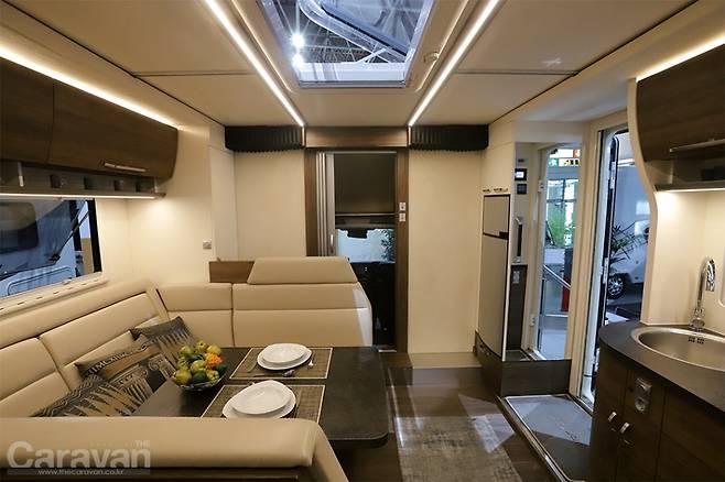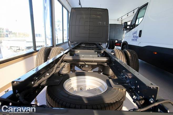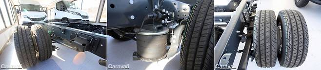 화물차였다면 승차감에 대한 이야기는 꺼내지도 않았을 것이다. 대략 1톤을 감당할 수 있는 타이어가 후륜에 4개, 어림잡아도 4.5톤 이상의 적재물을 지지할 수 있다. 여기에 후축 에어 서스펜션이 적용되어 있어 차체의 높이 조절은 물론이고 상황에 따른 유연한 대처가 가능해진다. 캠핑카에 있어서는 과스펙에 해당하므로 캠핑카 리뷰에 항상 따라다니는 뒤가 불안하니, 타이어가 작아 보이느니 하는 등의 댓글은 이 모델에는 사라지는 게 맞을 것으로 보인다. 타이어 공기압 모니터링 시스템까지 갖추고 있어 최적의 주행 조건을 유지, 안전성과 연료 효율에 있어 장점으로 꼽힌다.