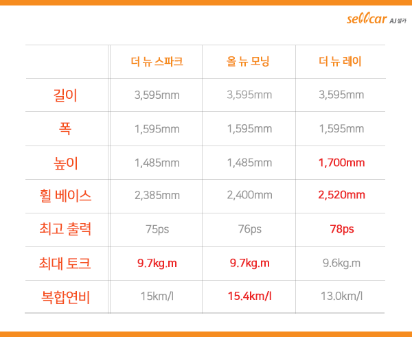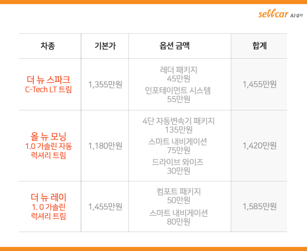 복잡한 도로와 좁은 골목길에서 주행하는 빈도가 높고, 평상시 탑승인원이 그리 많지 않다면 작지만 알찬 경차는 가장 매력적인 선택이 될 수도 있을 것입니다. 또한 경차는 크기와 배기량의 제한이 있는 만큼 신차와 중고차의 공간성과 성능이 큰 차이를 나타내지 않으므로 고객 각각의 사용 용도에 맞춰 합리적인 선택을 고려해보는 것도 좋을 것입니다.