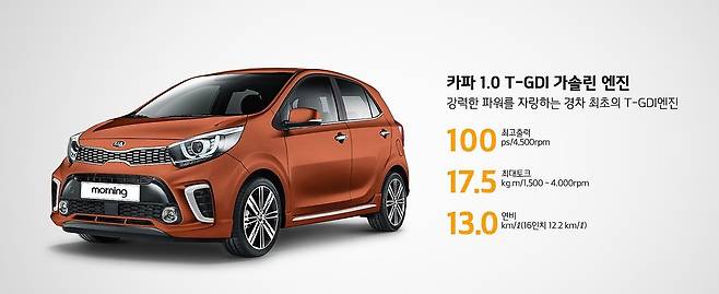 올 뉴 모닝은 1.0 에코 프라임 엔진과 1.0 T-GDI 가솔린 엔진, 그리고 카파 1.0 LPi 엔진의 3가지 엔진 라인업을 지녔습니다. 배기량은 모두 998cc로 동일하지만 에코 프라임 엔진의 최고출력은 76마력(6,200rpm), 최대토크는 9.7kg.m(3,750rpm)이고 LPi 모델은 최고출력 74마력(6,200rpm), 최대토크 9.6kg.m(3,500rpm)으로 유사한 수치를 나타내는 것에 비해 터보 모델은 최고출력 100마력(4,500rpm), 최대토크 17.5kg.m(1,500~4,000rpm)의 상대적으로 높은 성능을 발휘합니다.