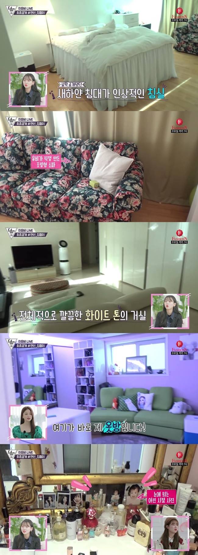 아울러 이유비의 개인방은 FashionN '팔로우미12'를 통해 공개됐다. 당시 이유비는 랜선 집들이를 해달라는 팬들의 요청에 새하얀 침대가 포인트인 깔끔한 침실을 공개했다. 이에 멤버들은 "공주님 방 같다"고 연신 감탄했다. 침대와 빌트인 옷장 옆엔 이유비가 직접 조립한 플라워 소파가 자리했다. 방문을 열고 거실로 나가자 화이트 톤 소파와 대형 TV가 자리한 이유비 방 거실이 드러났다. 이유비는 "제가 화이트톤을 좋아한다"며 인테리어 취향을 밝혔다. 이어 공개된 이유비 드레스룸엔 가방부터 액세서리, 선글라스 등이 깔끔하게 정리된 데 이어 개인 화장대까지 눈에 들어온다.