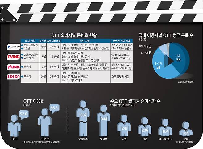 OTT는 다른 서비스 대비 경쟁력 확보를 위해 오리지널 콘텐츠와 독점 콘텐츠로 차별화를 시도하고 있다. 3000억~1조원대 다년간 투자 계획을 발표하는 등 콘텐츠 투자를 강화하고 있다.