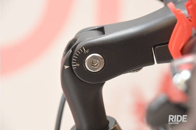서스펜션 시트포스트와 함께 승차감을 높이는 부분이 각도 조절 핸들 스템이다. 볼트를 풀고 각도를 조절한 다음 다시 볼트를 조이는 방식은 조금 번거로울 수 있지만 고정은 확실하다. 조절 범위는 0도에서 70도까지로 라이더 신체에 맞추면 된다. 스템 각도를 조절했을 때는 핸들바 위치가 바뀌는 만큼 핸들바도 풀어서 다시 맞출 필요가 있다.