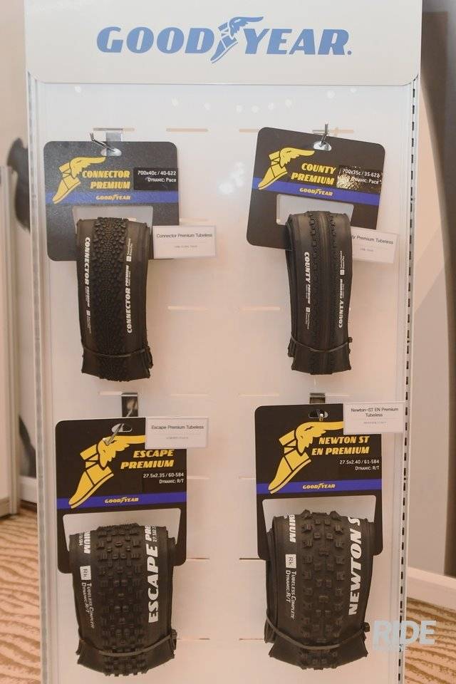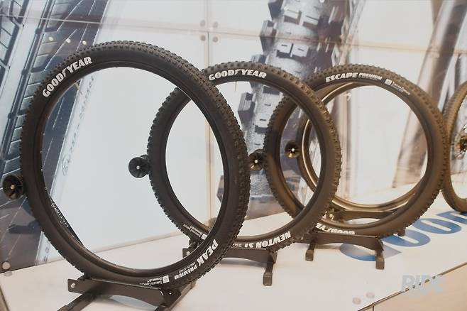 크로스컨트리용 타이어인 피크, 엔듀로/다운힐용 타이어인 뉴튼, 트레일용인 이스케이프는 림에 장착해서 전시했고, 그래블 목적의 카운티와 커넥터는 포장 상태로 걸려 있었다. 굳이어가 출시한 타이어 전 라인업은 튜브리스 방식이며, 안정감을 위해 같은 장르의 타사 제품에 비해 폭이 조금 넓은 편이다.