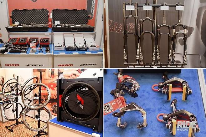 스램 그룹 제품들도 전시돼 있었다. MTB용 12단인 XX1 이글, 로드용 무선 전동 변속 시스템 스램 레드 이탭, 파워미터 쿼크, 브레이크인 가이드, 코드와 레벨 등 스램 부품이 한쪽을 차지했다. 입구 옆에는 락샥 서스펜션 포크가 있었고, 짚 휠세트도 한쪽에 있었다. 스램 부품들 사이에는 다이렉트 마운트 브레이크인 S-900이 있었다.