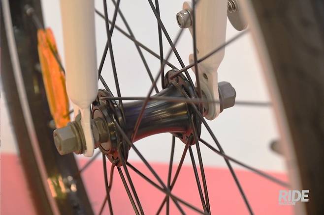 시트스테이 부분에는 짐받이 장착용 마운트를 추가했다. 이전의 팬텀제로가 스포티한 측면을 강조했다면 이번 모델은 좀 더 생활 밀착형으로 바뀌었다. 사진으로는 차이가 잘 보이지 않지만, 핑크색 프레임은 기존의 흰색, 검정색 프레임에 비해 높이가 70mm 정도 낮다. 배터리 분리용 레버, 짐받이 마운트, 낮아진 프레임 높이는 핑크색 모델에 우선 적용됐고, 점차 흰색과 검정 프레임으로 적용 범위를 넓힐 예정이다.