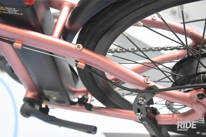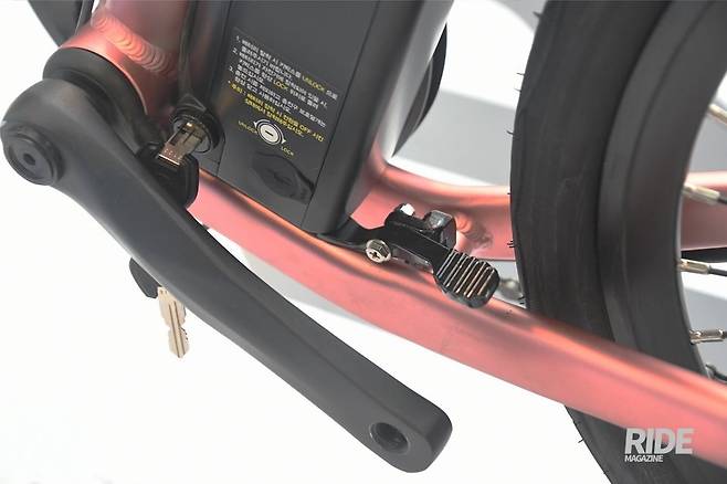시트튜브 뒤쪽에 있는 배터리 부분이 개선됐다. 정확히는 발로 밟아서 배터리를 들어 올려주는 레버를 장착한 것이다. 성인 남성의 경우 배터리 탈부착이 크게 어렵지 않지만, 무게와 형태 때문에 빼기 어렵다는 의견이 있었고 배터리를 빼기 쉽게 레버를 추가했다.