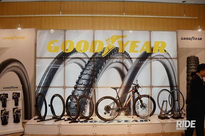 안쪽 벽면에는 새로 론칭하는 브랜드인 굳이어 타이어를 크게 전시했다. 1898년 자전거 타이어 생산으로 시작했다가 1977년에 자전거용 타이어 생산을 중지했으나, 작년에 로드바이크부터 MTB까지 전 라인업의 타이어를 발표했다.