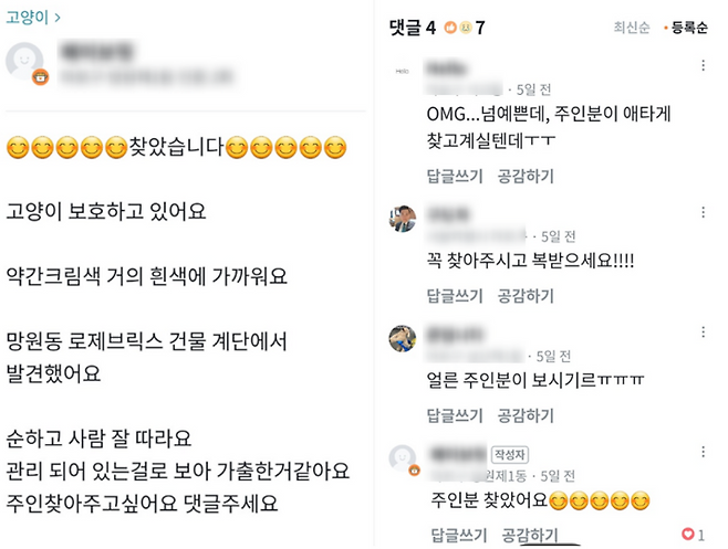 당근마켓은 반려동물이 집을 나갔을 때 사람들이 많이 찾는 곳이기도 하다. 동네 이용자가 많기 때문이다. 이때는 중고거래가 아닌 동네 정보 카테고리에 글이 올라온다. 최근 서울 마포구 도화동에는 고양이를 보호하고 있다는 글이 올라왔다. 게시자는 임시 보호하고 있는 고양이 사진과 함께 발견 장소를 밝혔다. 그리고 얼마 후 글 제목이 '찾았습니다'라고 바뀌었다. 고양이 주인이 해당 글을 보고 잃어버렸던 반려묘를 찾은 것이다. 반려동물뿐 아니라 잃어버린 틀니, 차 열쇠 등을 찾아주는 사례도 많다.