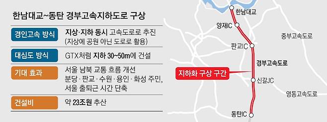 그동안 거론된 경부고속도로 지하 건설은 고속도로 때문에 나뉘어진 생활권을 잇고 주변 주거환경을 쾌적하게 하고자 추진됐다. 서울 서초구가 구상했던 한남대교 남단~양재IC 구간 6.8㎞ 지하화는 지하 1, 2층에 상·하행선을 분리 건설해 12차로를 확보하고, 지상에는 공원 등을 꾸며 단절된 동서 생활권을 연결하자는 것이다. 현재 공사 중인 동탄 신도시 지하도로 건설과 같은 개념이다.