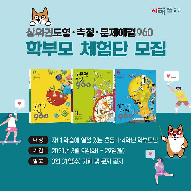 체험단 전원은 960 시리즈 3종 중 1권의 교재를 학습한 후의 생각과 의견을 온라인 서점과 커뮤니티에서 공유하는 미션을 수행하게 된다. 체험단 우수자 30명에게는 체험 교재 중 1권이 추가 증정될 예정이다. 자세한 내용은 시매쓰출판 공식 홈페이지 또는 카페 ‘수학이 좋아!’에서 확인할 수 있다.
