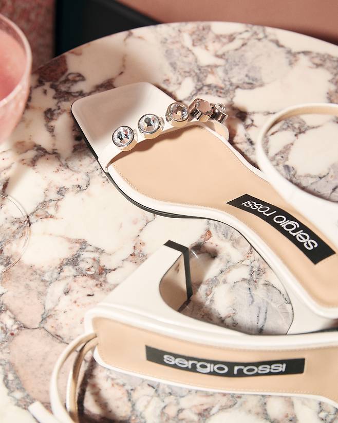 세르지오 로시의sr1Pump를 착용 앞코의 큐빅 장식이 포인트로