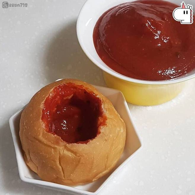 1. 모닝빵 윗부분을 꼬집어서 파내고 토마토 소스를 바른다.