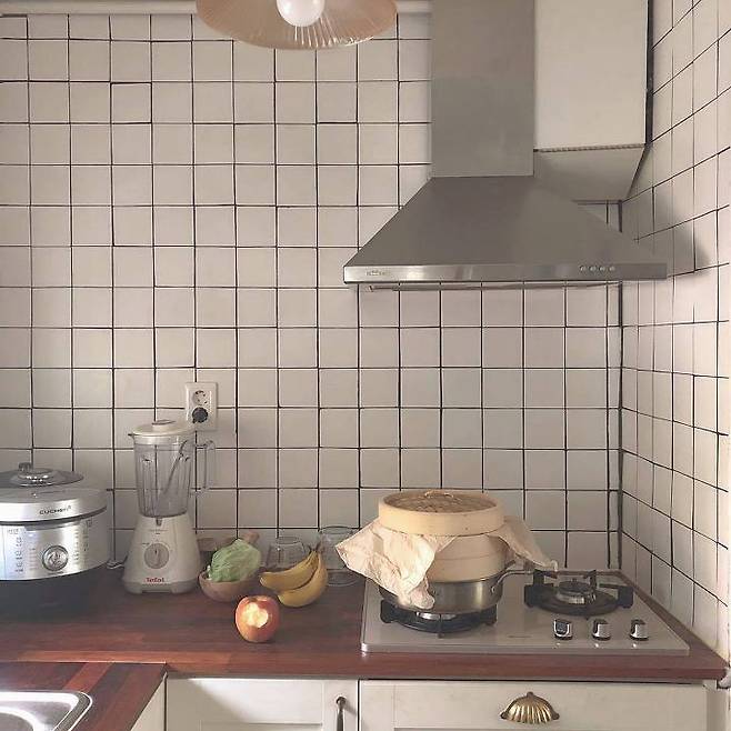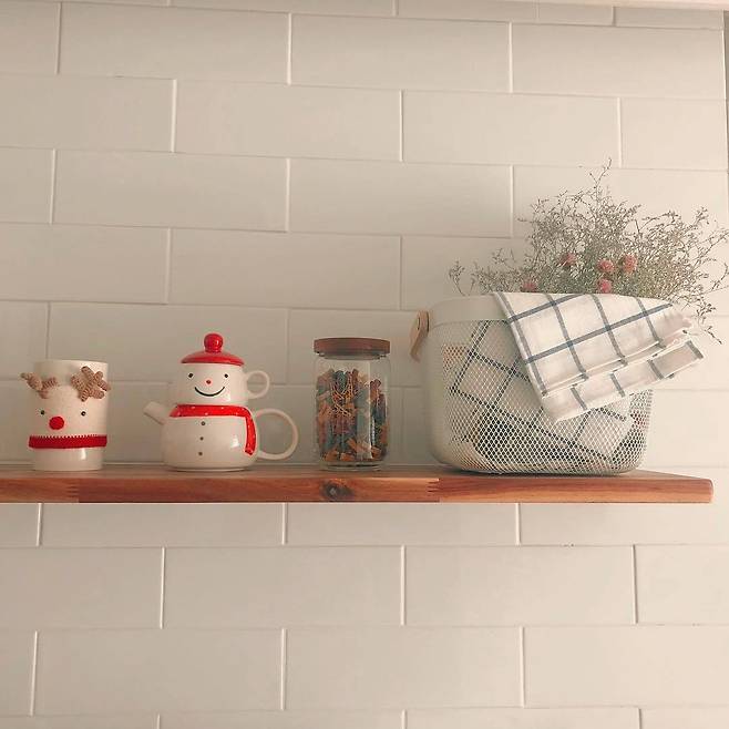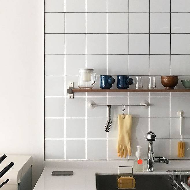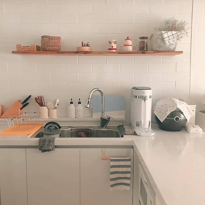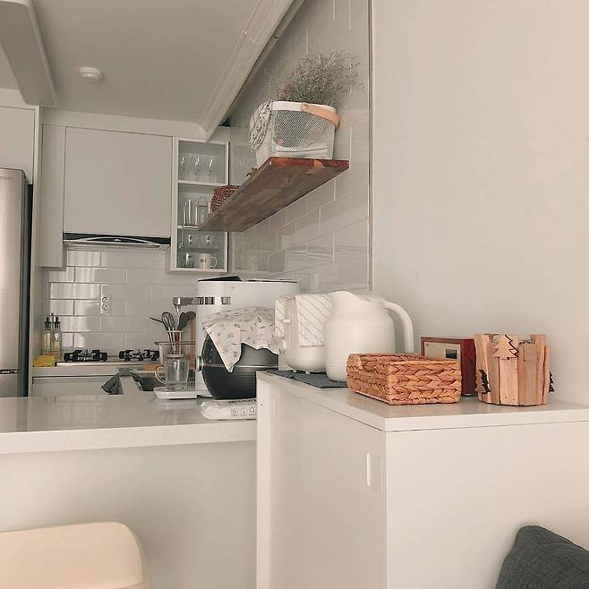 신혼집에서 제 취향이 몽땅 모인 주방입니다. 상부장 대신 선반을 달아 제가 좋아하는 소품을 올리고 그릇은 옆 수납장에 보관하고 있어요. 작지만 편안하고 따뜻한 공간에서 사부작사부작 서툰 음식을 할 때가 요즘 가장 좋아하는 시간이에요. - ♥