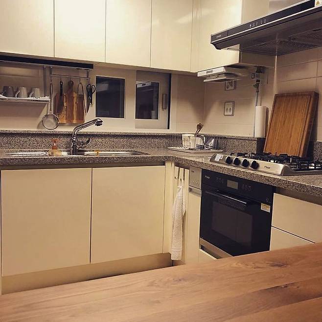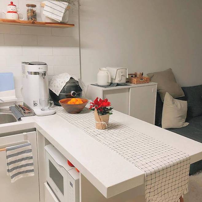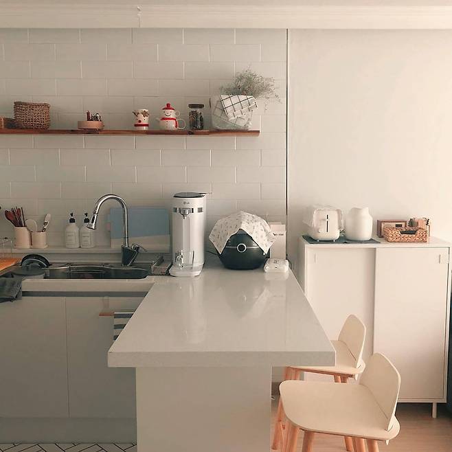 안녕하세요. 2년 안된 신혼부부입니다. 원하던 느낌의 주방을 머릿속에 그려보며 하나하나 천천히 꾸몄더니 카페가는 횟수가 줄더라구요. 집에서 지인들도 초대하여 간단한 브런치도 먹고, 저희 부부가 홈카페도 즐기고 있는 공간입니다. :-)