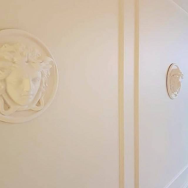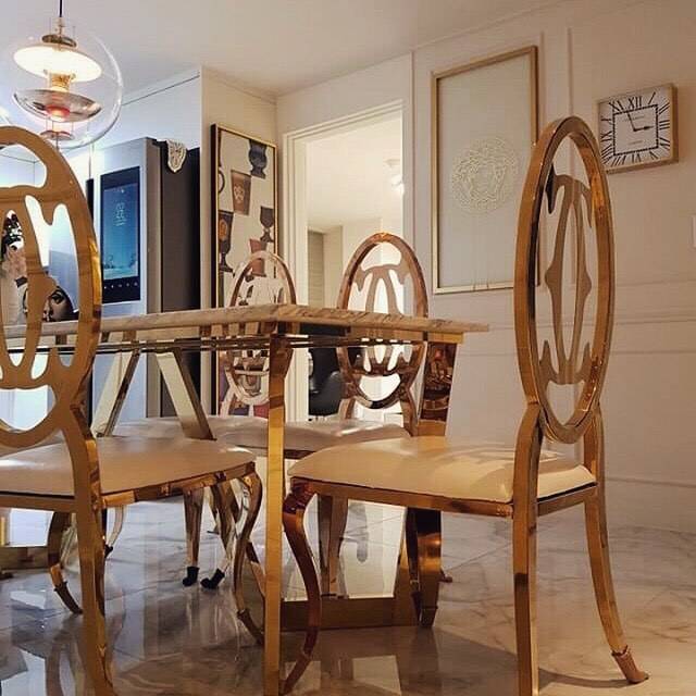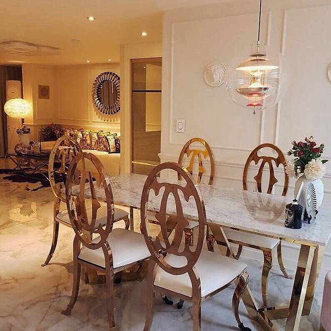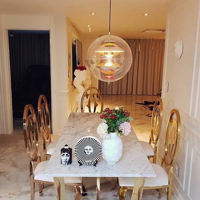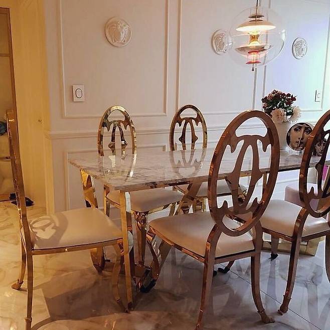 테이블 : 갤러리구도 주문제작 / 의자, 벽장식, 골드액자 : 자체제작 / 화병 : Jonathan Adler Gala Round Vase / 스툴 : Kare Design Stool Cherry Baby Pink / 엔틱잔액자 : 포르나세티 보헤미아 엔틱잔 액자 화이트 / 펜던트등 : Verpan Globe Brass Suspension Pendant Gold / 시계 : Kare Design Table Clock Flow (냉장고 위), Casa Alexis London Bridge Clock (정사각형)
