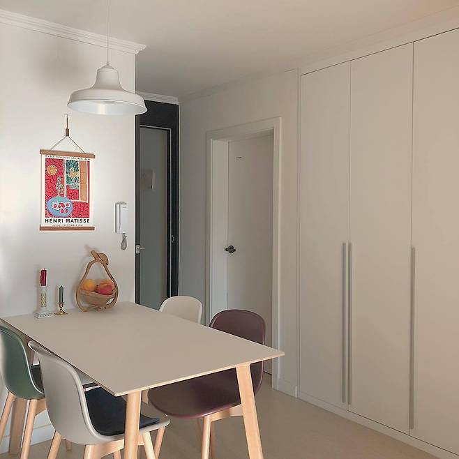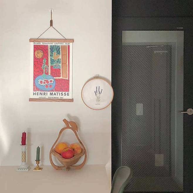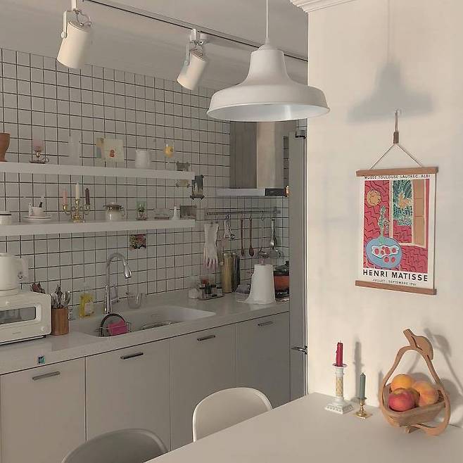 의자 : HAY Neu13 Chair / 하부장, 싱크대 : 한샘 맞춤제작 / 촛대 (식탁 위) : 달리센트 편집샵 / 행잉프레임, 과일바구니 : 구디페이퍼 / 전기포트 : 발뮤다 더 팟 화이트 K02C / 토스터 : 발뮤다 The Toaster K01K White / 테이블 : HAY Copenhague Deux CPH 210 Table / 선반 위 소품 : 촛대(심미안), 레몬향초(베러댄), 엽서(아우어스튜디오), 티팟(오디너리홈)