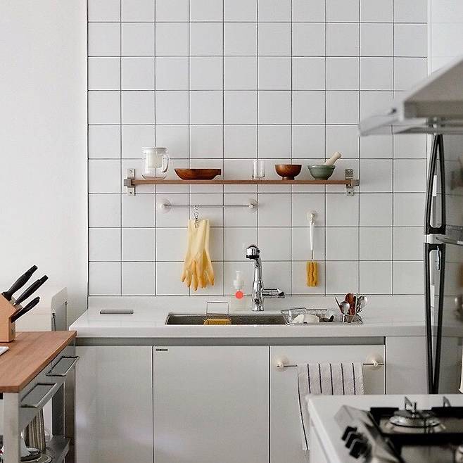 행거 : 무인양품 타월 행거 / 행주 : 이케아 ELLY 엘뤼 행주 / 오븐홀더 : 무인양품 오븐 홀더 / 타월걸이 : 아카시아 홈 주방 타월걸이 / 냉장고 : LG전자 B607SM 일반냉장고 / 칼블럭세트 : 헨켈 데피니션 칼블럭 5종세트 / 작업대 : 이케아 RIMFORSA 림포르사 작업벤치