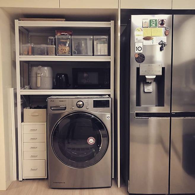 소스유리병 : 레트로맘 / 식기 : 오덴세 아틀리에 노드 / 수납박스 : 창신리빙 저안트레이 / 건조기 : LG전자 트롬 RH14VH / 냉장고 : LG전자 DIOS J811S35 / 서랍장 : 마켓비 FIHA 서랍장 4.1단 / 식탁, 의자 : 리바트 크런치 원목식탁 / 전기레인지 : LG전자 DIOS BEY3GT1 / 전기밥솥 : 쿠쿠전자 CRP-JHR0620FD / 선반장 : 한샘 재크 철제 5단 베란다랙 1100 / 나무도마 : 이케아 APTITLIG 압티틀리그 대형도마 / 에어프라이어 : 필립스 터보스타 에어프라이어 HD9626