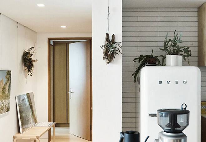‘도라’의 방으로 이어지는 공간. 곳곳에 행잉 플랜트를 두어 알바알토의 ‘세컨 네이처’ 디자인에 충실하려 노력했다. 의자와 벤치는 모두 핀란드 빈티지 숍에서 공수했다.
