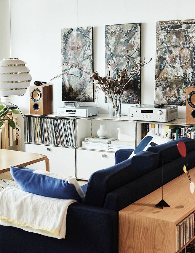 펜던트 조명 ‘비 하이브’는 Artek. 모듈형 수납장은 Usm. 소파는 Artek. ‘805D 다이아본드 북 셸프’ 스피커는 B&W. 원목 장 위에 놓인 모빌은 Volta.