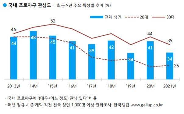 KBO리그 개막 직전 전국 성인 남녀 1000명을 상대로 전화조사한 결과 34.1%만 프로야구에 관심이 있다고 밝혔다.