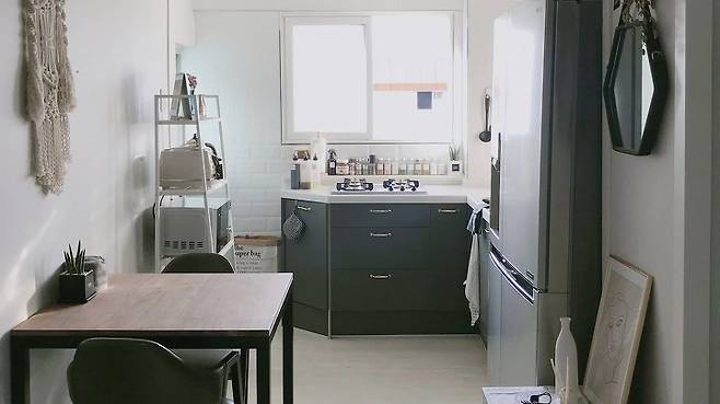 저희 집은 주방과 거실이 직사각형으로 쭉 이어져 있어 두 공간 모두 같은 분위기로 인테리어를 하면 밋밋해 보일 것 같았어요. 그래서 그레이 톤으로 통일성을 주되, 주방에 힘을 주고 거실은 최대한 심플하게 꾸미기로 했어요.