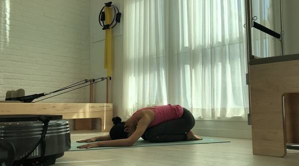 7. 바닥에 두 무릎과 발등, 이마를 내려놓고 COOL DOWN. 엉덩이를 발뒤꿈치 위에 내려놓고 휴식해준다.