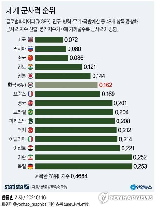 (서울=연합뉴스) 반종빈 기자 = 16일 미국의 군사력 평가기관인 글로벌파이어파워(GFP)의 보고서에 따르면 한국은 군사력 평가지수 0.1621을 받아 지난해와 같은 세계 138개국 중 6위에 올랐다.