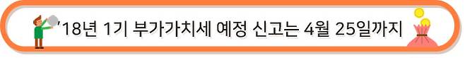이번 신고 대상자는 85만 명으로, ’17년 1기 예정신고(80만 명) 보다 5만 명이 증가하였습니다. 개인 일반과세자는 직전 과세기간(’17.7.1.~’17.12.31.)에 납부한 부가가치세의 1/2에 해당하는 고지세액을 4월 25일(수)까지 납부하여야 합니다. 다만, 개인사업자가 사업이 부진하거나 조기환급이 발생하는 경우 예정신고방법을 선택할 수 있습니다.