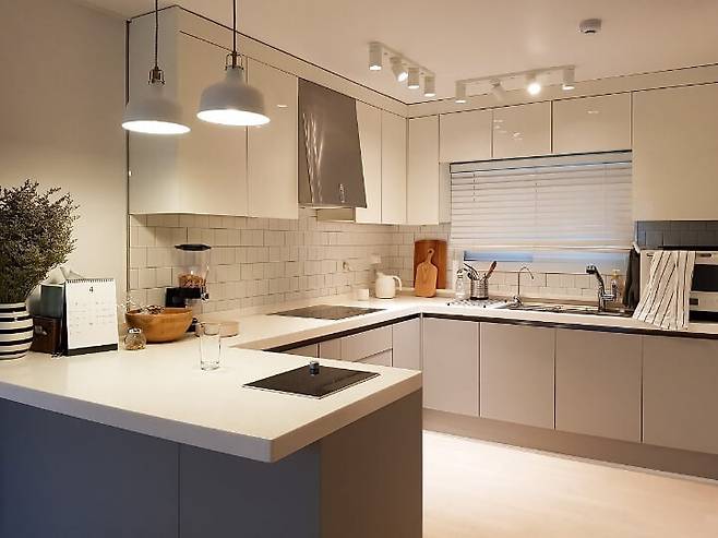 거실과 마주 보며 요리할 수 있는 구조의 주방