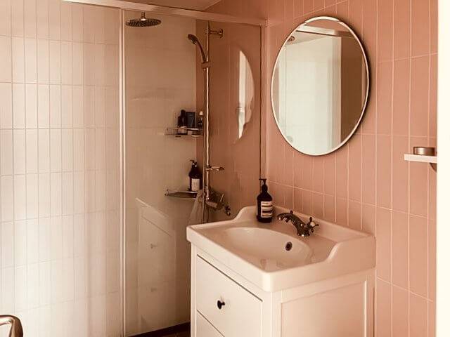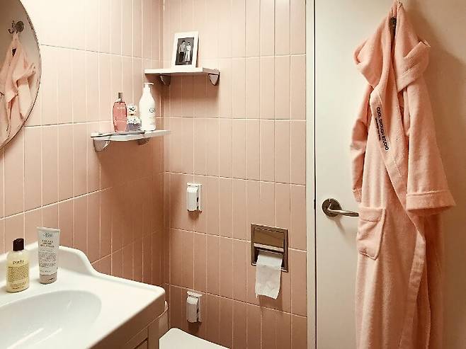 세면대 : 이케아 HEMNES 헴네스, RATTVIKEN 레트비켄 세면대2단하부장 / 거울 : 이케아 GRUNDTAL 그룬드탈 거울 / 로브 : 쿨이너프스튜디오 THE ROBE LARGE PINK